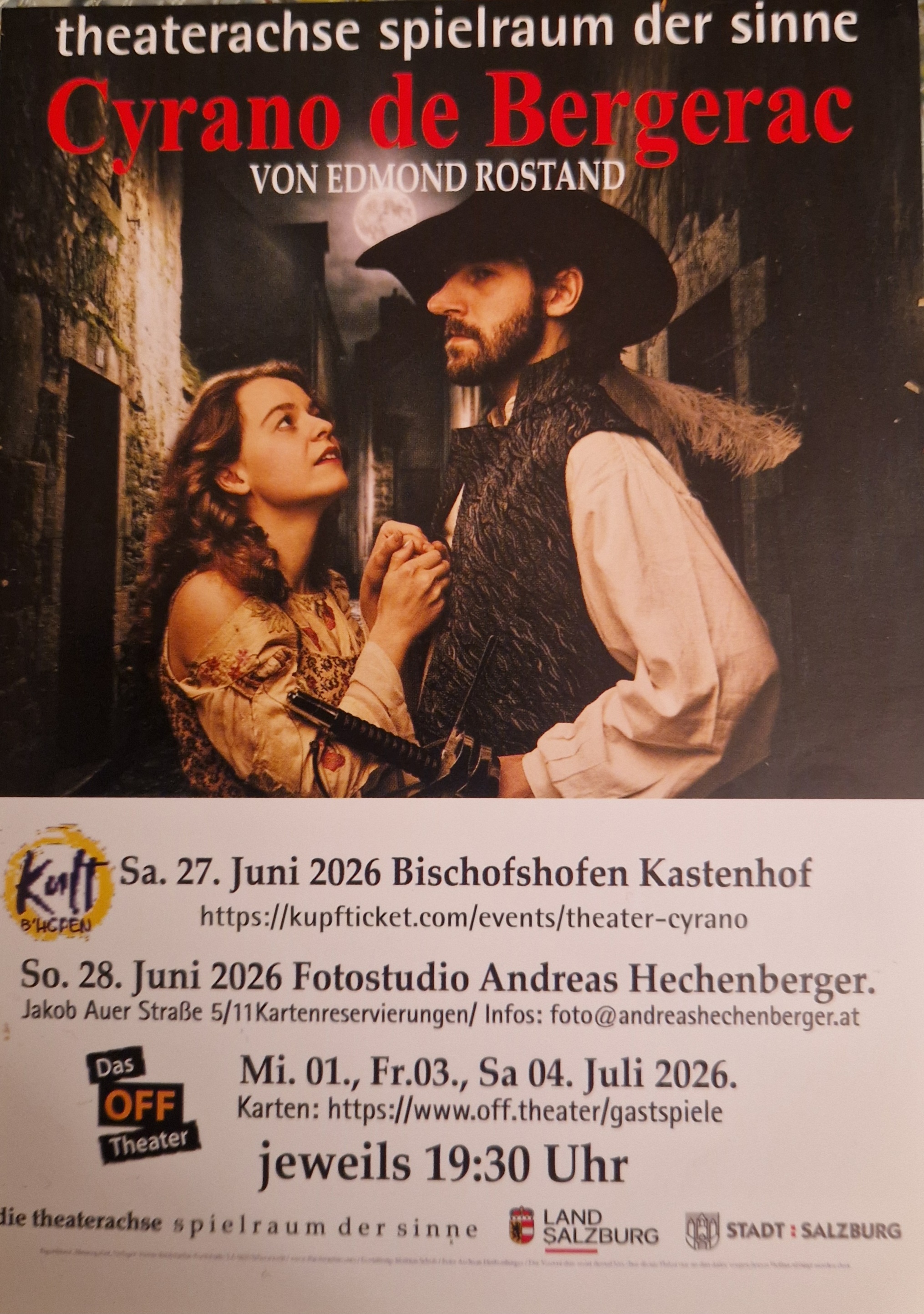 Er ist nach Hamlet der wohl ikonischste Held der Theatergeschichte und zum 30-jähriges Jubiläum der „Theatertage auf der Mildenburg“ findet er wieder den Weg auf die Freilichtbühne. 30 Jahre ist es her, seit das damals blutjunge Team der Theaterachse, diesen Klassiker der Weltliteratur dort auf die Bühne brachte. Und nun ist es wieder so weit. Wir kehren zurück ins Frankreich zur Zeit der „Drei Musketiere“. Cyrano de Bergerac gefürchteter Fechter und verehrter Dichter in einer Person hat einen Makel: Seine übergroße Nase und jeder, der sich darüber lustig macht, bekommt seinen Degen zu spüren. Aber sein größter Schwachpunkt: Er ist in seine gutaussehende Cousine Roxane verliebt. Da er ihre Ablehnung fürchtet, wagt er es nicht seine wahren Gefühle zu offenbaren. Doch gerade, als er sich ein Herz nehmen will, gesteht ihm Roxane ihre Zuneigung zu seinem neuen Regimentskameraden, dem eher schlicht gestrickten Schönling Christian de Neuvillette. Nicht ganz uneigennützig ist Cyrano bereit, diesen zu unterstützen, indem er an seiner Stelle Liebesgedichte an Roxane schreibt. Cyrano verliert sich in der Rolle des unerkannten Liebhabers mehr und mehr auf. Nebenbei muss er hundert Mann besiegen, um einen Freund zu schützen und die Intrigen des mächtigen Grafen Guiche abwehren, der gleichfalls ein Auge auf Roxane geworfen hat. Doch gerade als man denkt Cyrano würde um eine Nasenlänge vorne liegen kommt alles anders als erwartet …